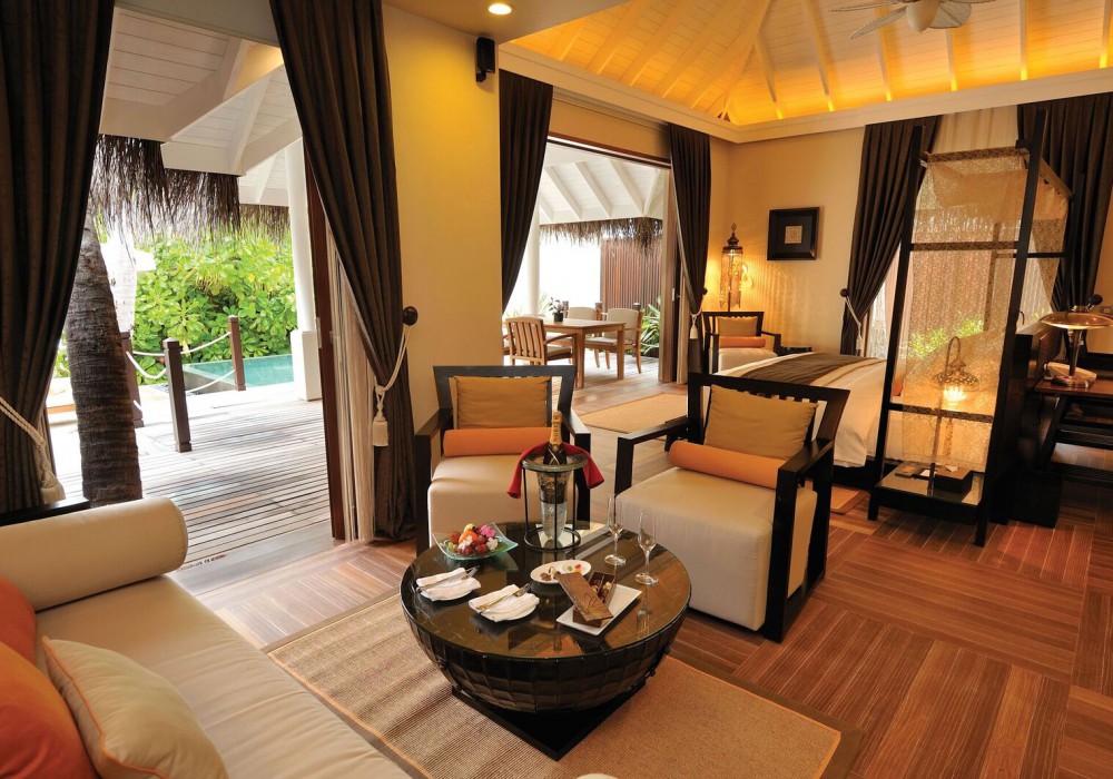 1 номер Royal Ocean Suite with Pool (2 bedroom) (318 кв. м, располагаясь особым образом на краю пристани, этот двухуровневый президентский сьют находится на отдельном участке и включает две просторные спальни с собственными ванными комнатами: одну на первом этаже и другую — на втором. Прихожая с обеденным столом и отдельной шикарной жилой зоной со стеклянным полом, отдельный буфет, балкон на верхнем этаже с открытым видом на бескрайний горизонт и наружная терраса, выходящая к океану. Также имеется душевая снаружи, гамаки, бассейн с джакузи и прямой выход к лагуне)