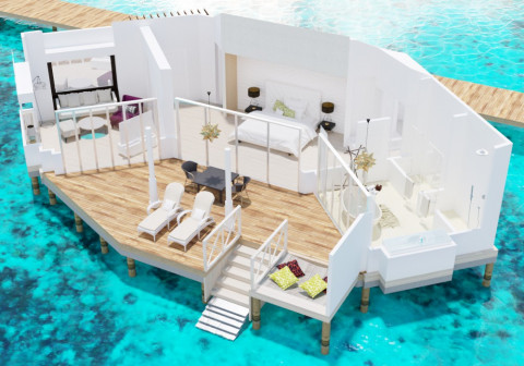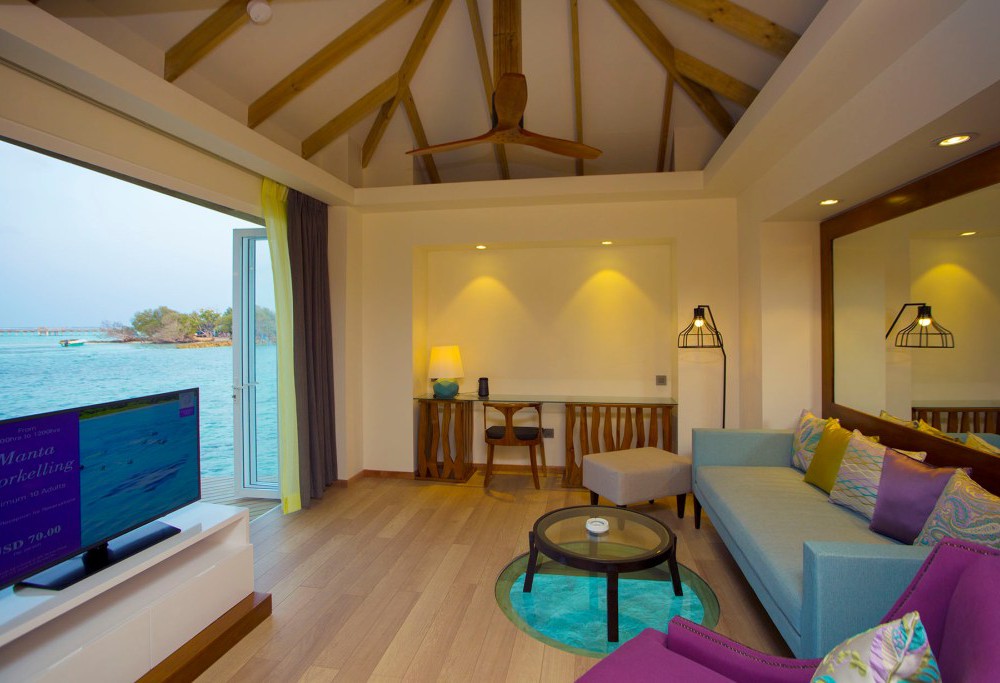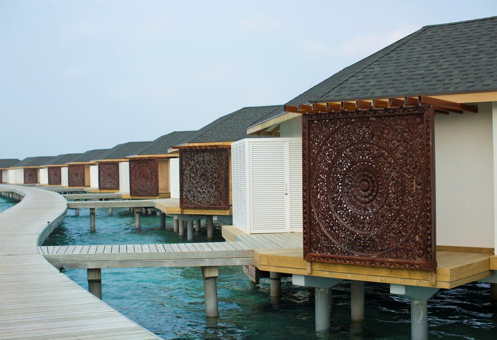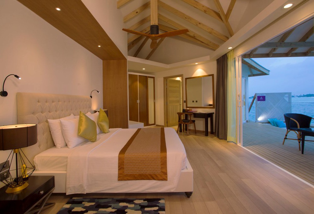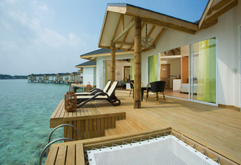 24 номера Over Water Suite (95 кв.м, индивидуальные бунгало на воде с прямым спуском в воду, спальня с кроватью king-size, зона гостиной с раздвижной дверью, возможно поставить одно доп. место, стеклянная панель в полу, ванная комната с ванной и душем, дополнительно в номере есть кофе-машина, халаты и тапочки, гамак на террасе)