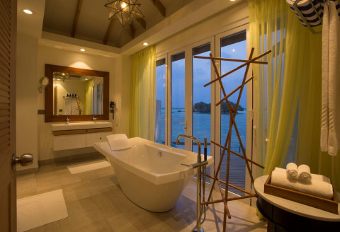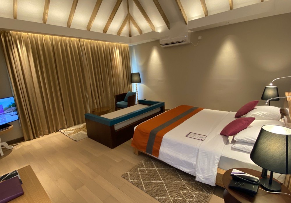36 номеров Water Bungalow (63 кв.м, индивидуальные бунгало на воде с прямым спуском в воду, спальня с кроватью king-size, возможно поставить одно доп. место, ванная комната с душем и ванной с джакузи, дополнительно в номере есть кофе-машина, халаты и тапочки)