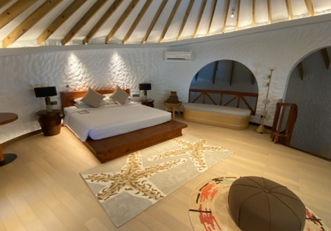 8 номеров Junior Beach Suite (95 кв.м, бунгало на берегу (по 2 номера в каждом), выход к пляжу, спальня с кроватью king-size, возможно поставить два доп. места, ванная комната открытого плана с ванной и душем, дополнительно в номере есть кофе-машина, халаты и тапочки)