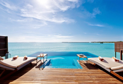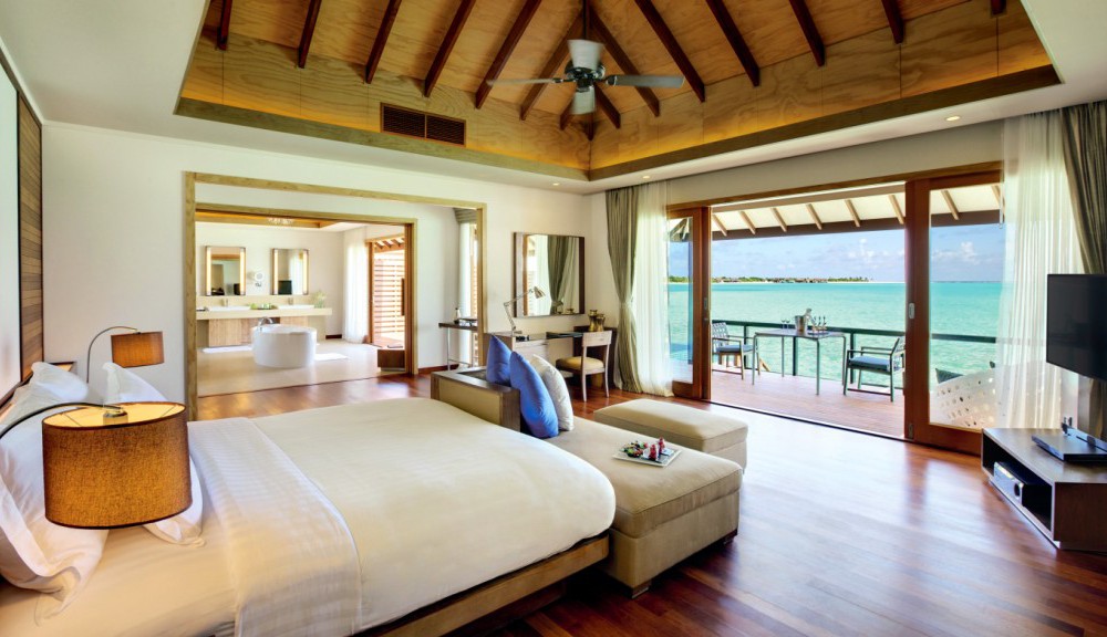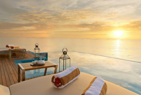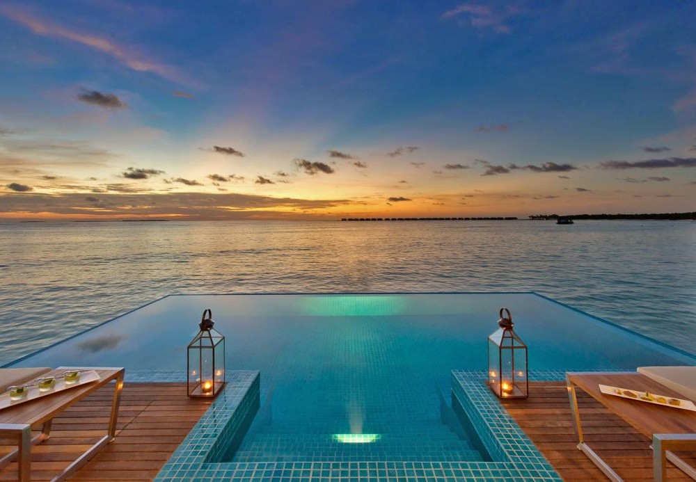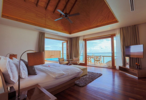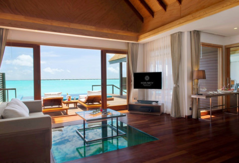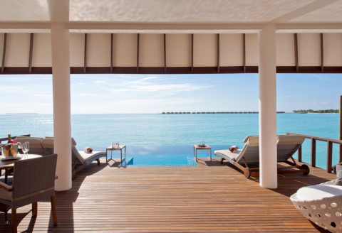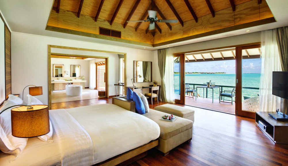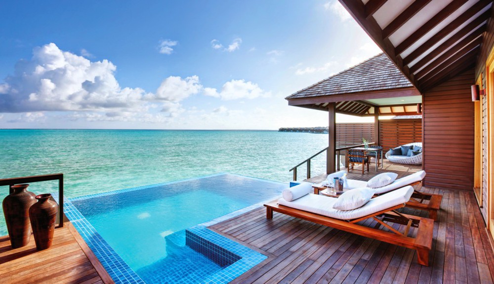 2 номера Ocean Suites with Pool (330 кв.м., трехкомнатные водные виллы с прямым спуском в воду, 2 спальни с кроватью king-size с пологом, 2 ванных комнат, отдельная гостиная с обеденной зоной, терраса с бассейном с открытым краем)