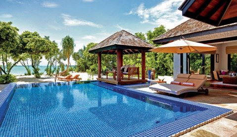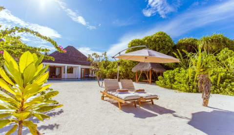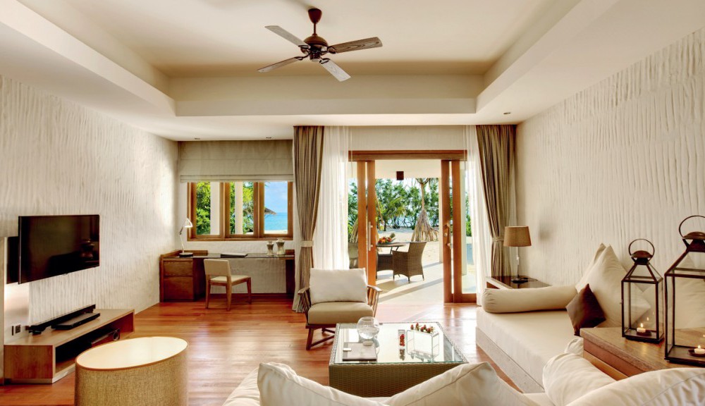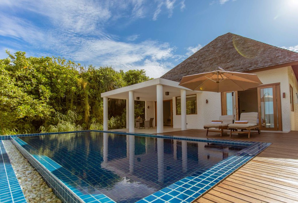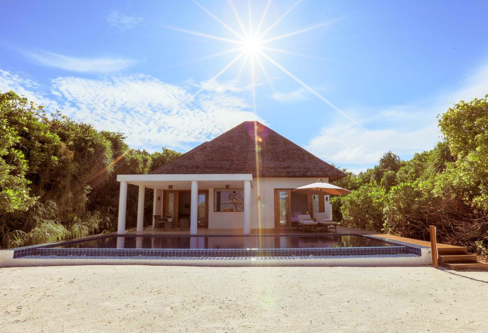 2 номера Beach Residences with Lap Pool (315 кв.м., двухкомнатные виллы с 1 спальней, расположенные на берегу, состоят из спальни с кроватью king-size с пологом, гардеробной, отдельной гостиной со столиком и диванами, ванная комната на открытом воздухе, терраса с лежаками, приватный садик с обеденным павильоном и качелями, приватный бассейн (55 кв.м.))