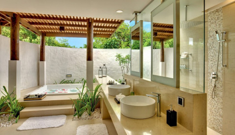 2 номера Hideaway Palaces (1420 кв.м., береговые виллы с 3 спальными, все комнаты находятся в отдельных павильонах, расположенных на широкой деревянной террасе с несколькими бассейнами, в главной спальне круглая кровать с пологом и отдельная зона отдыха, 2 гостевые спальни с кроватью king-size, в каждом павильоне-спальне есть собственная ванная комната с ванной и тропическим душем, часть ванной расположена под открытым небом, в 2 других павильонах гостиная и столовая, терраса с лежаками и обеденная зона)
