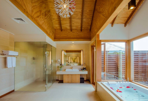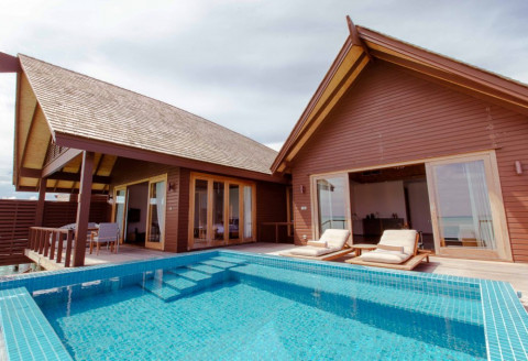 5 номеров Ocean Villas with Pool (290 кв.м., новые однокомнатные водные виллы с прямым спуском в воду, состоят из спальни с двуспальной кроватью, гостевой зоны с письменным столом, ванной комнаты с душем и ванной, деревянная терраса с собственным бассейном (30 кв. м), отдельная открытая гостиная с обеденной зоной. )