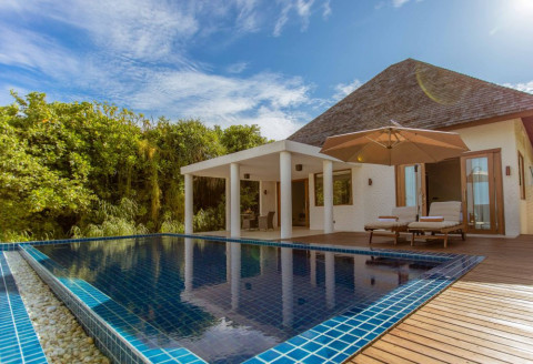7 номеров Family Villas with Pool (440 кв.м., двухкомнатные двухуровневые виллы на берегу с 1 спальней, состоят из спальни с кроватью king-size с пологом, гардеробной, отдельной гостиной со столиком и диванами, ванная комната на открытом воздухе, гостевой туалет, терраса с лежаками, приватный садик с обеденным павильоном и качелями, приватный бассейн (95 кв.м.), на втором этаже расположен уютный меблированный балкон с видом на океан)