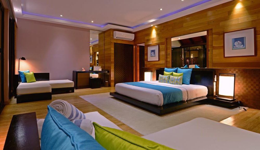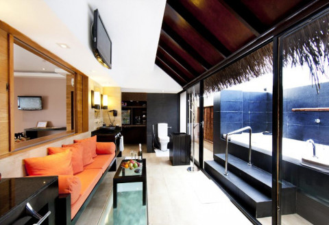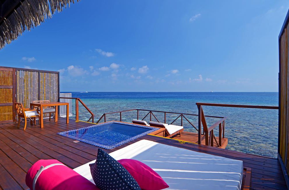 4 номера Honeymoon Villas (117 кв.м, виллы на воде с прямым спуском в воду, ванная комната с джакузи и стеклянной панелью в полу, частный бассейн, расположены на отдельной джетти)