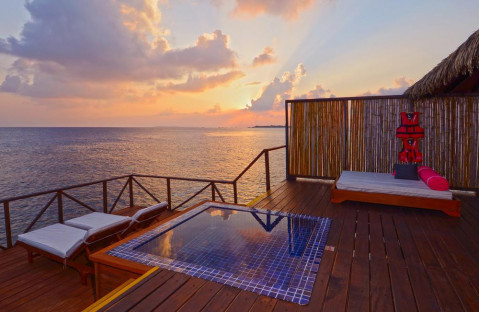 24 номера Sunrise Water (91 кв.м, виллы на воде с прямым спуском в воду, ванная комната с джакузи и стеклянной панелью в полу, частный бассейн, вид на рассвет)