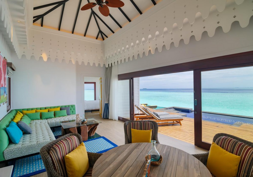 Two Bedroom Overwater Pool Villa (240 кв.м, виллы над водой с двумя спальнями, две ванные комнаты, отдельная гостиная, мини-кухня, терраса с прямым спусков в воду)