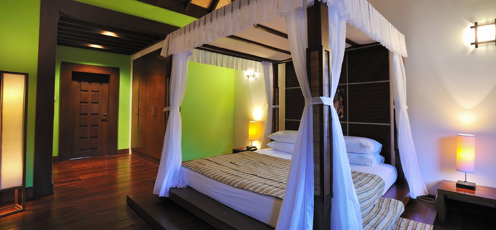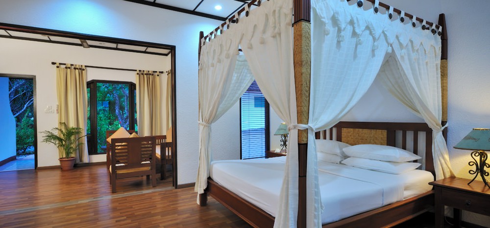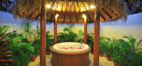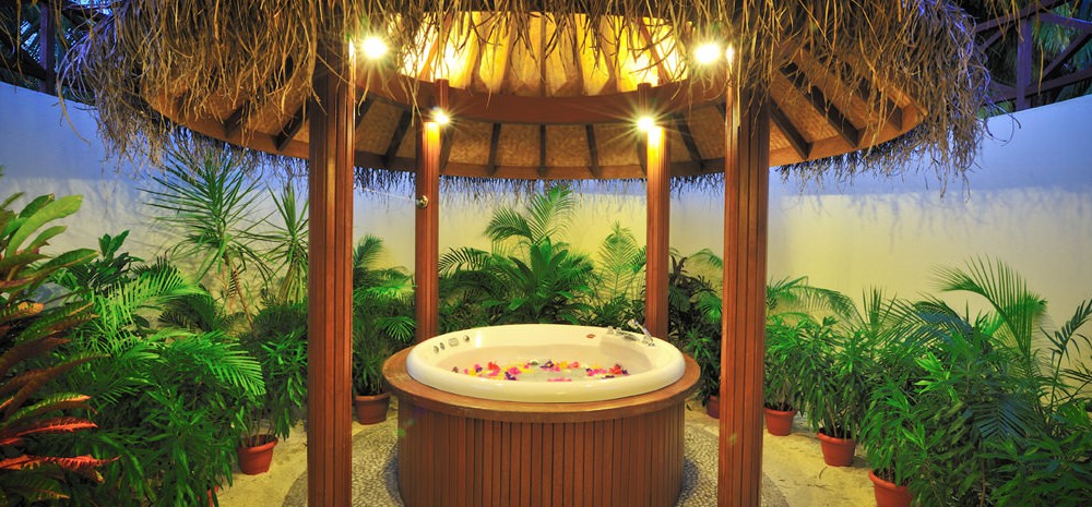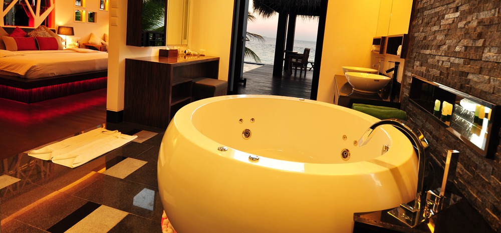 2 номера Water Villas (116 кв. м, водные виллы на юго-западной стороне острова; спальня, гостиная, зона отдыха, ванная комната, джакузи, душ, биде, душ на открытой террасе)