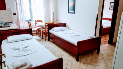 APARTAMENT 1+1, около 49 м², двухкомнатный апартамент без балкона. Всего в отеле 8 апартаментов. Типы кроватей: 1 двуспальная кровать + 2 односпальные кровати (в 4-х апартаментах); 1 двуспальная кровать + 1 двухъярусная кровать (в 4-х апартаментах).