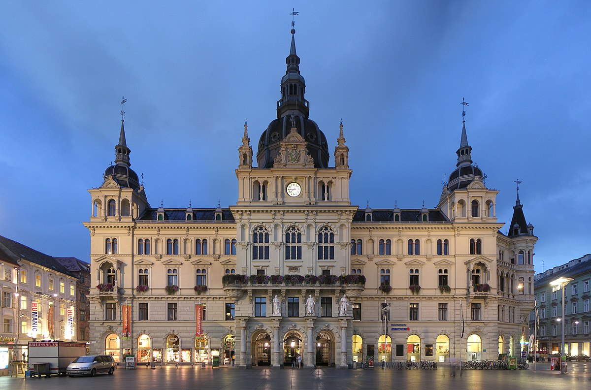 Она находится на южной стороне Главной площади, оживляемой многочисленными рыночными лотками, и является уже третьей ратушей точно на этом же месте. В центре Главной площади находится фонтан эрцгерцога Йоханна как память о „штирийском принце", основателе музея Йоаннеум, из которого вырос Технический университет.