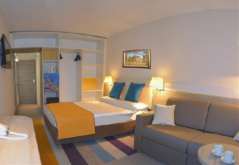 DBL: с видом на парк, аквапарка или бассейн; в номерах двуспальная кровать и двухместный раскладной диван или 2 кровато 90х200 см и раскладное кресло; ванная комната с душем; макс.3в.+1р., 3в.; 18м2.