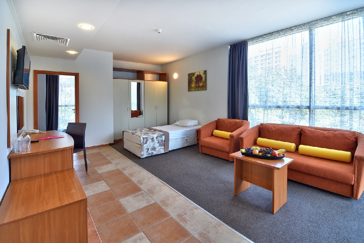 APARTMENT: 2 комнаты с межкомнатной дверью; в спальне – 1 двухспальная кровать, ванная с душем; в гостиной – 1 односпальная кровать, 1 двухместный раскладной диван, 1 раскладное кресло, ванная комната с ванной; макс.3в.+2р., 40-50м2.