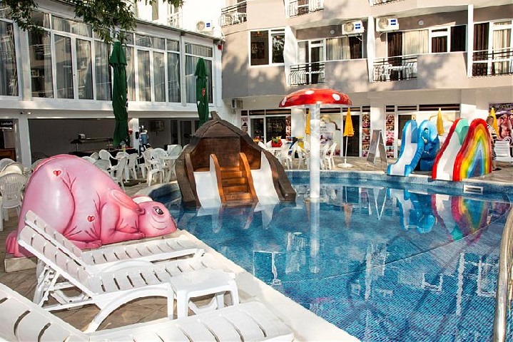 отдельный детский бассейн с небольшими водными горками(пиратский корабль, четыре фонтана и четыре горки)