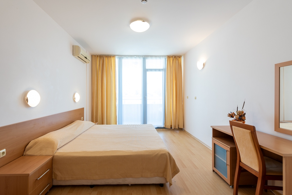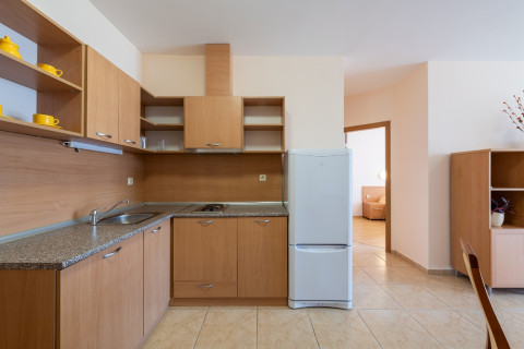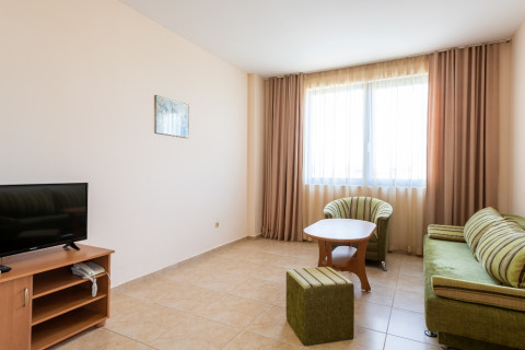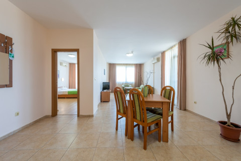 APARTMENT TYPE A: 2 помещения, дверь между комнатами, 1 двуспальная кровать, раскладной диван; кухонный уголок с оборудованием: плита, эл.чайник/по запросу/; 1 ванная комната с ванной и 1 туалет; макс.2в.+2р., 3в.+1р., 4взр.;