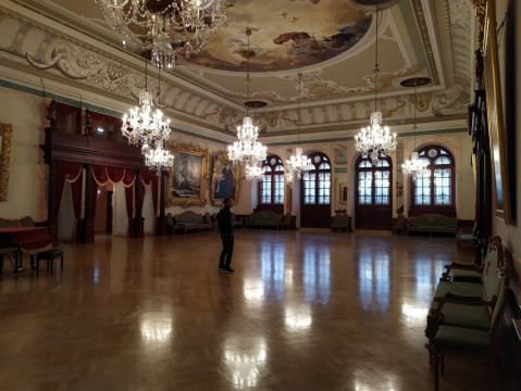 - Внутри, в представительских помещениях привлекают внимание роскошные предметы интерьера — хрустальные люстры, расписные потолки, портреты правителей в позолоченных резных рамках, герб братства, красочные витражи;