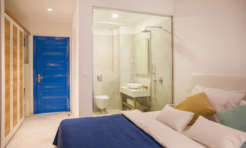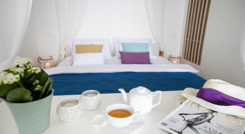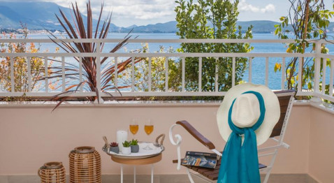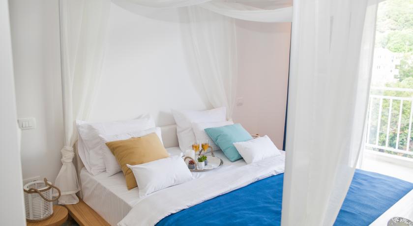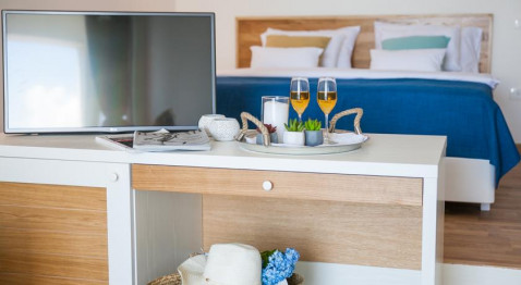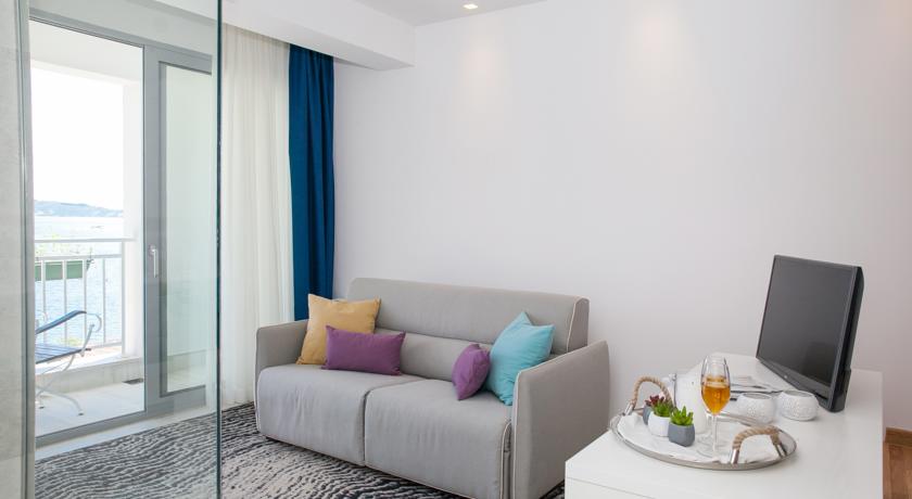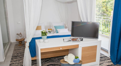 В DELUXE DBL SV: однокомнатный номер с французской кроватью и раскладывающейся софой, кондиционер, спутниковое телевидение, Wi Fi интернет, прямая телефонная линия, мини бар, сейф, санузел с душевой кабиной, туалетные принадлежности, фен, халаты, тапочки, балкон с видом на море. Площадь номера 32м2. Максимальное размещение 2+1 человека.