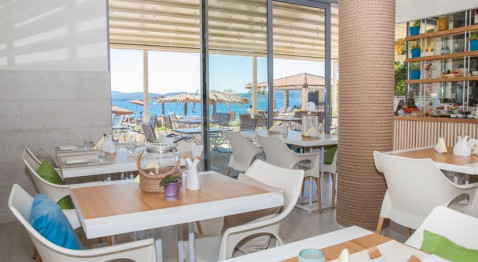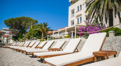 В 5 м от отеля, собственный песчано-галечный пляж, оборудованный лежаками и зонтиками.