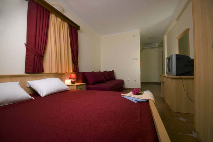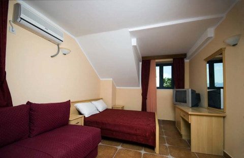 В номере: Французская и дополнительная кровати, кондиционер, телевизор, мини-бар, без балкона, вид на море, душ. Максимальное размещение – 2+1 или 2+2.