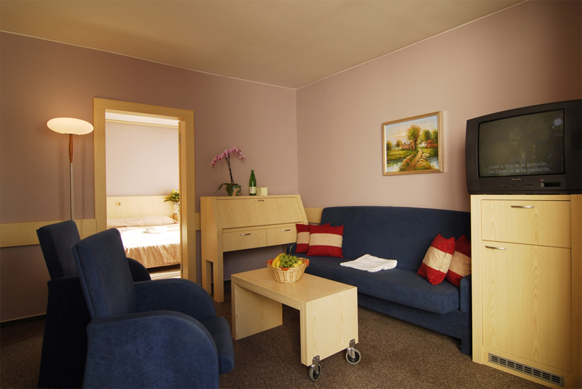 Superior deluxe apartma: 3 х апартамента, все с видом на лес. Общая площадь около 50m² + терраса 10m²: гостиная и спальня находятся в одном большом помещении, которое переграждено стеной/ перегородкой. С двух сторон перегородки стоят телевизоры – один смотрит в спальню, второй - в гостиную.