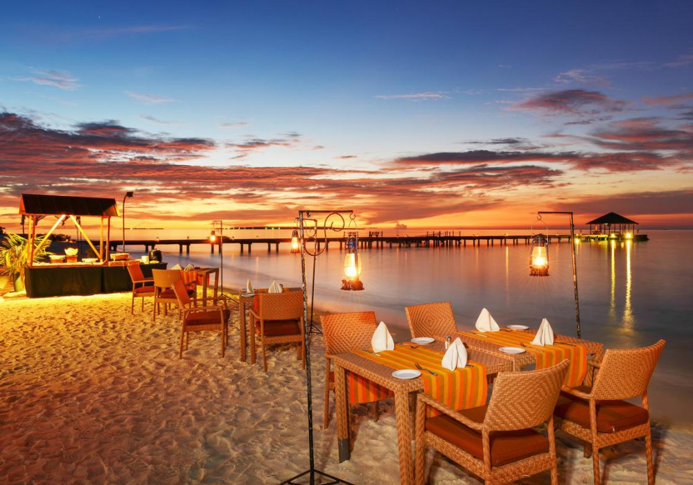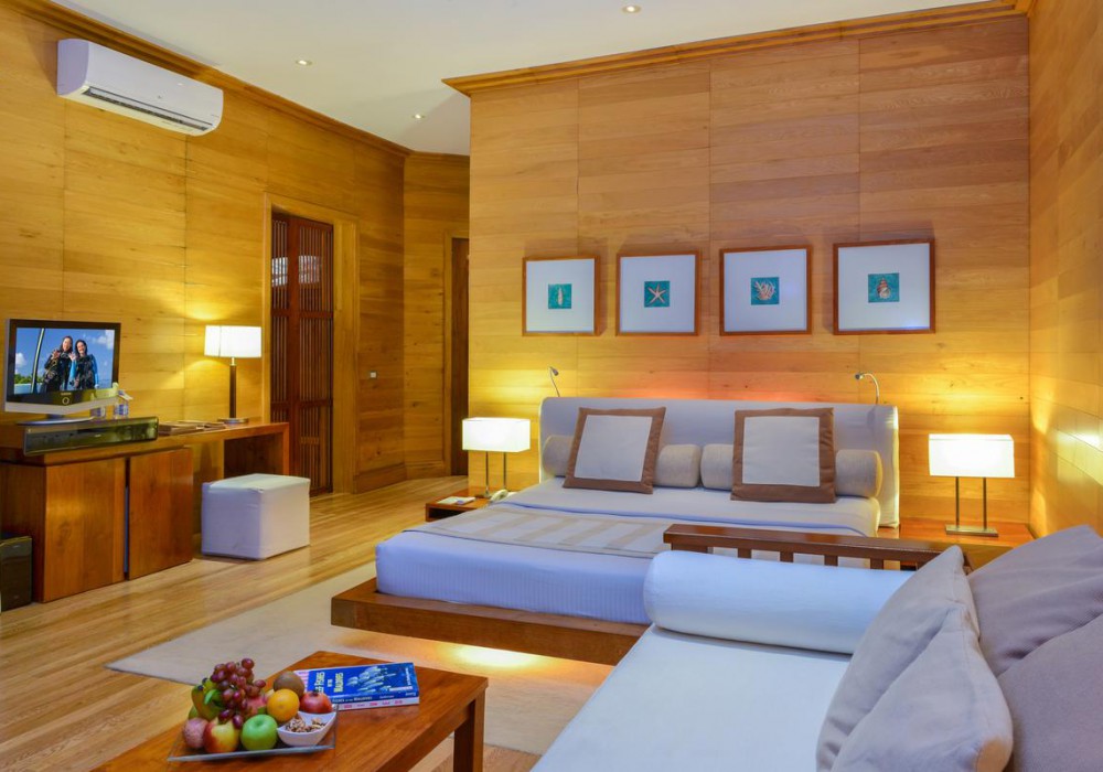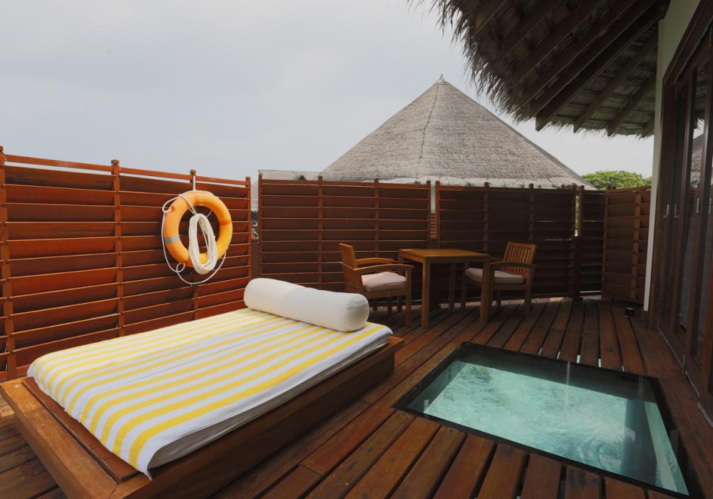 10 номерів Sunset Beach Villa (27 кв.м, номери в берегових одноповерхових бунгало, по 2 номери в кожному, розташовані в західній частині острова, вид на захід, ванна кімната відкритого плану)