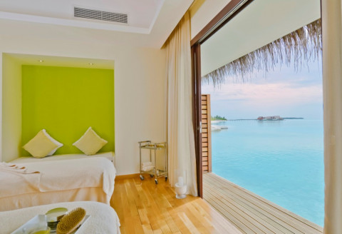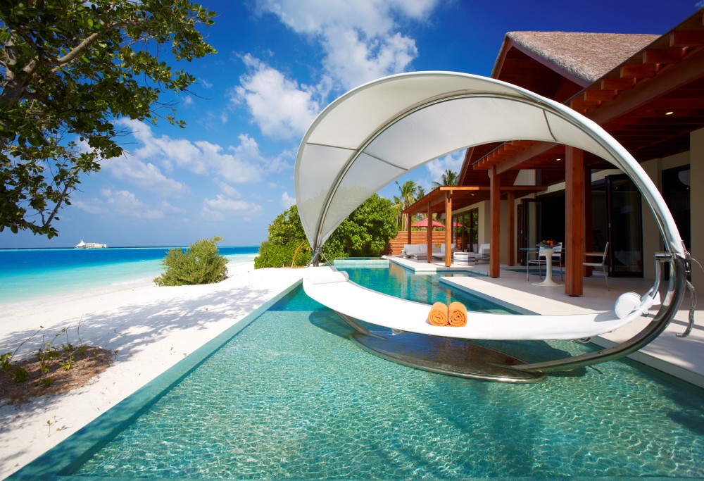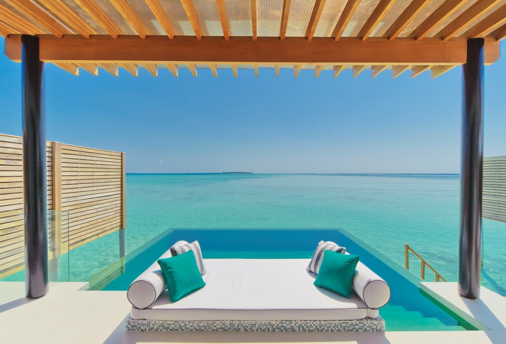 2 номери Water Pavilions with Pool (340 кв. М, номери на воді, мають басейн, вітальню і обідню зону, джакузі, прямий доступ до лагуни.)