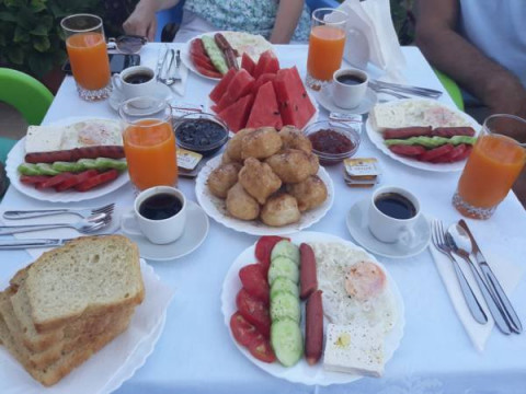 Розміщення в готелі на базі сніданків (подаються порційно, включають кілька видів яєць, сир, сосиски, огірки, помідори, хліб, вершкове масло, мед, варення, хліб; з напоїв: сік, чай, кава, молоко).