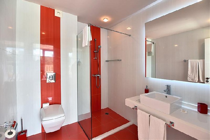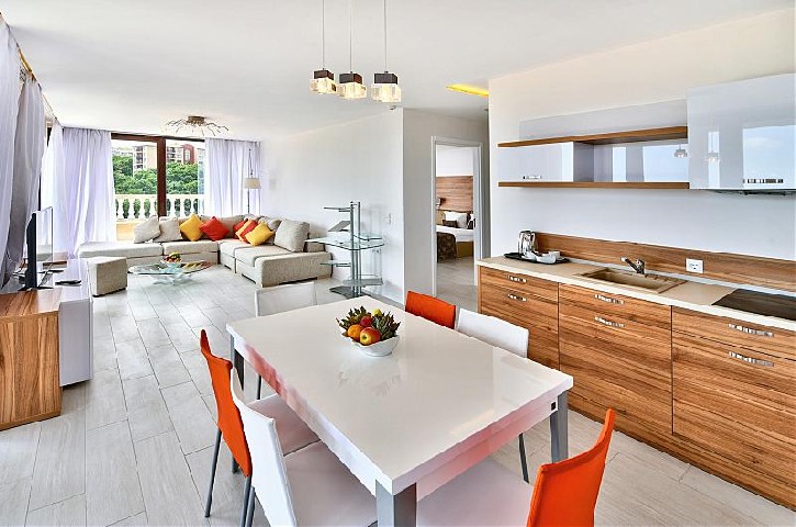 2 BEDROOM APARTMENT: 2 приміщення або 3 приміщення (в залежності від кількості гостей), двері між кімнатами, 1-а спальня: 1 двоспальне ліжко / 180x200см. /, 2-ая або 3-а спальня: два односпальні ліжка / 100x200см. / , розкладний диван, ванна кімната з душем, 2 туалети; макс. 4в. + 2д., 5в. + 1д .; 6в .; 48м2;