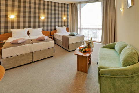 STUDIO: три основні ліжка / 100 / 200см. /, Розкладний диван / 120 / 100см. /, Макс.2в. + 2р., 3в. + 2р., 40 кв.м. Номери з боковим видом на море.