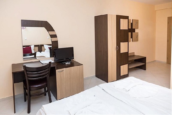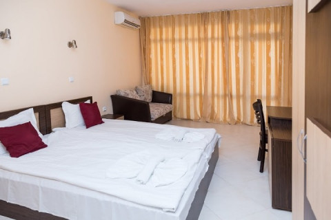 У центральній частині курортного комплексу Сонячний берег, в 250м. від пляжу. Побудований в 2008 році. / Двомісні економ-номери-18кв.м, двомісні стандартні номери-25кв.м, студія з кухнею-30кв.м.