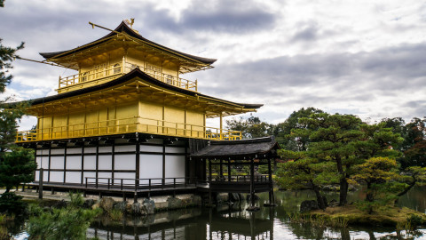 Храм Кінкакудзі - Золотий павільйон був побудований в 1397 р. за наказом сегуна Йосіміцу з династії Асикага, тут він провів останні роки свого життя, втративши всякий інтерес до політичного життя країни. Усамітнившись з найближчими друзями в цій ""золотий вежі" він віддавався філософським роздумам, насолоджувався чайною церемонією і прилучався до таємниць буддійської релігії. Після смерті сьогуна Йосіміцу його син перетворив Кінкакудзі в буддійський храм — така була воля отця. Від багатого палацового комплексу залишився тільки один Золотий павільйон - нині Національне надбання Японії.