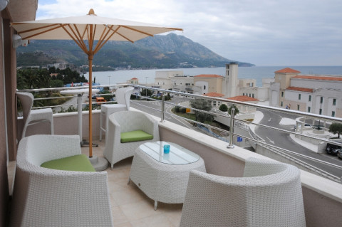 В 150м від піщано-галькового муніципального пляжу Бечічі (лежак - 2 євро, парасолька - 2 євро), куди можна дістатися по надземному переходу.