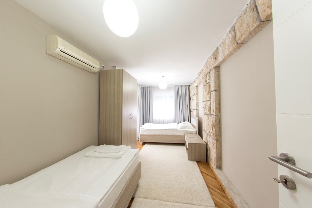 На Вилле: простора вітальня з обладнаною кухнею, терасою та видом на острів Святий Стефан, 6 спалень, з них 4 спальні з французьким ліжком, 1 з двома роздільними ліжками і 1 з одномісним ліжком. Кондиціонери, супутникове ТБ, Wi Fi інтернет, два санвузли з душовими кабінами. Максимальне розміщення: 11 осіб.