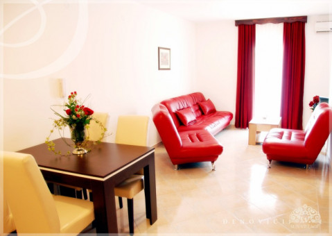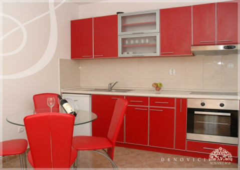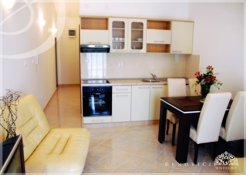 В апартаменті: Спальня з великою французьким ліжком, простора вітальня з вбудованою, повністю укомплектованою кухнею, їдальня. Кондиціонер, кабельне телебачення, інтерфон, холодильник, бездротовий інтернет, ванна кімната з душовою кабіною, велика тераса з видом на море.