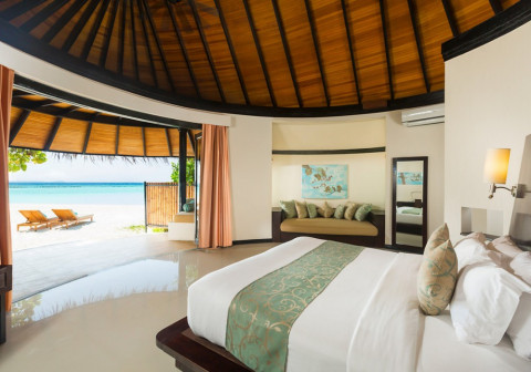 40 номеров Deluxe Beach Villas (125 кв. м, виллы на берегу с видом на пляж и лагуну, ванная комната с джакузи, беседка с тростниковой крышей на пляже)