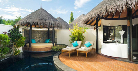 1 номер Celebrity Retreat 3-Bedroom Villa (600 кв. м, 2х этажная вилла с садом и 2-мя частными бассейнами, 3 спальни, обеденный павильон, тренажерный зал, 3 ванные комнаты, джакузи, сауна)