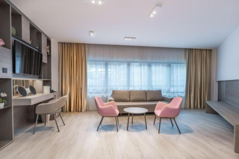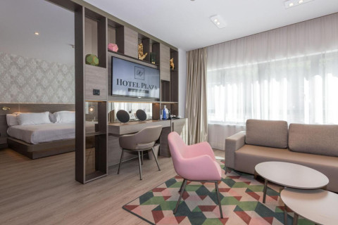 Deluxe Room (35 м2, макс. 3+0 чел.) в некоторых номерах есть ванна с гидромассажем, зона гостиной и спальни без двери, диван-кровать, ванная комната с двумя раковинами (ванна или душ), мини-бар, кофемашина, два 49 "Smart TV, часть номеров с балконом
