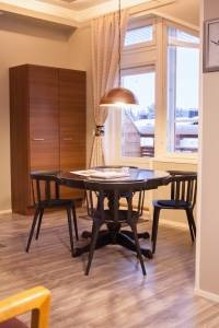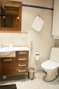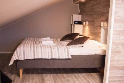 Апартамент-студия:одна большая кровать и раскладной диван, мини-кухня, cауна, душевая комната, туалет, балкон.