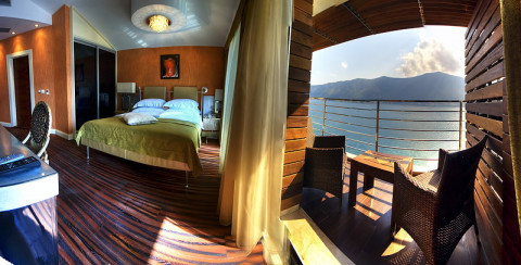 В DELUXE: Всего 4 номера в разной цветовой гамме, французская кровать, кондиционер, сейф (бесплатный), кабельное телевидение, телефон, доступ к интернету, душевая кабина, фен, косметика, французский балкон. Максимальное размещение -2 чел.