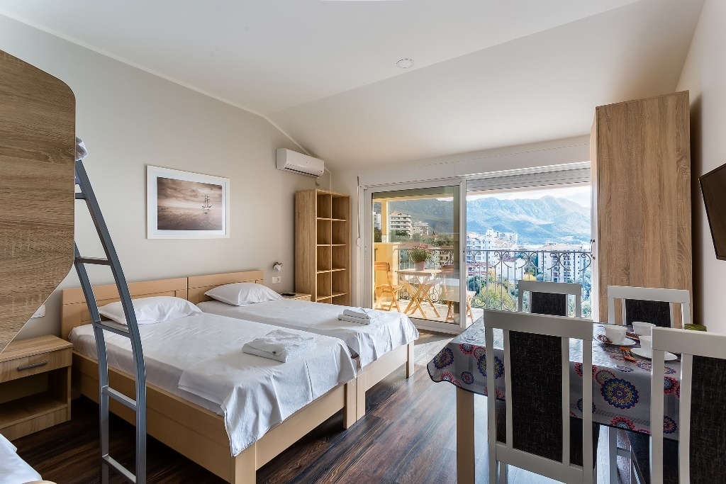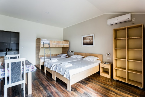 2 studio 03 extra (24 m2) - номера с французской кроватью и двухъярусной кроватью, душ/туалет, балкон с видом на море. Максимально допустимое размещение – 3 человека + 1 ребенок до 12 лет.