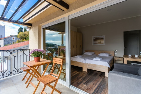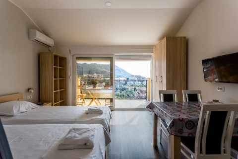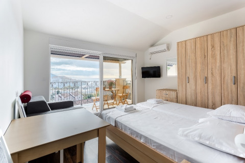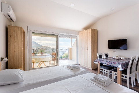 2 studio 02 extra (18 m2) - номера с французской кроватью и раскладным креслом для ребенка, душ/туалет, балкон с видом на море. Максимально допустимое размещение – 2 человека + 1 ребенок до 12 лет.