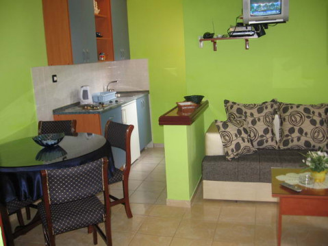 B APP: Двухкомнатный номер на первом этаже без балкона, в спальне французская кровать, в зале - раскладной диван и раскладное кресло, мини-кухня, кондиционер, спутниковое телевидение, сейф, фен, ванная комната.