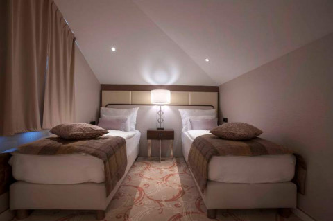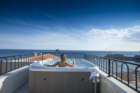 В DELUXE SUITE SV: гостиная с софой и оборудованной кухней, две спальни, в каждой из которых французская кровать, кондиционер, спутниковое ТВ, Wi Fi интернет, мини бар, чайник, камин, сейф, санузел с душевой кабиной, фен, халаты и тапочки, терраса с джакузи и видом на море (30 м2). Максимальное размещение: 5 человек.