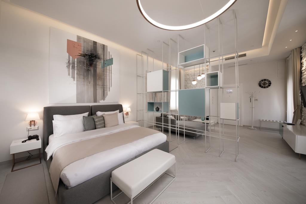 В JUNIOR APP GV: зонированный номер, состоящий из гостиной и спальни с французской или раздельными кроватями, кондиционер, Wi Fi интернет, кабельное телевидение, сейф, мини бар, санузел с душевой кабиной, халаты, вид во двор. Площадь: 39-50 м2. Максимальное размещение – 2 чел.
