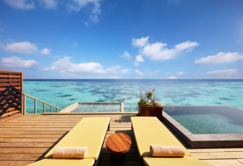 2 номери Overwater Pool Suite (153 кв.м., вілли над водою на палях з прямим спуском у воду, спальня з ліжком king-size, ванна кімната відкритого плану, тераса з лежаками, приватний басейн)