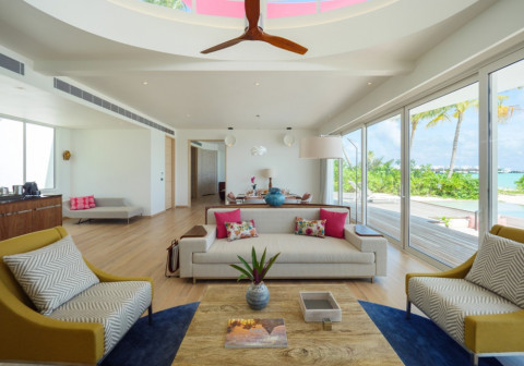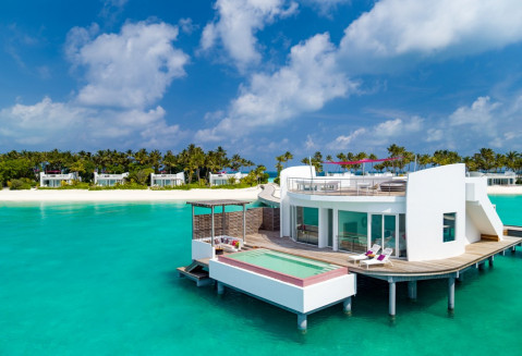 6 номерів Water Villa (110 кв.м (всередині приміщення) / 351 кв.м (загальна площа), вілли на воді з прямим спуском у воду, з однією спальнею, вітальнею і приватним басейном, частковий вид на океан)