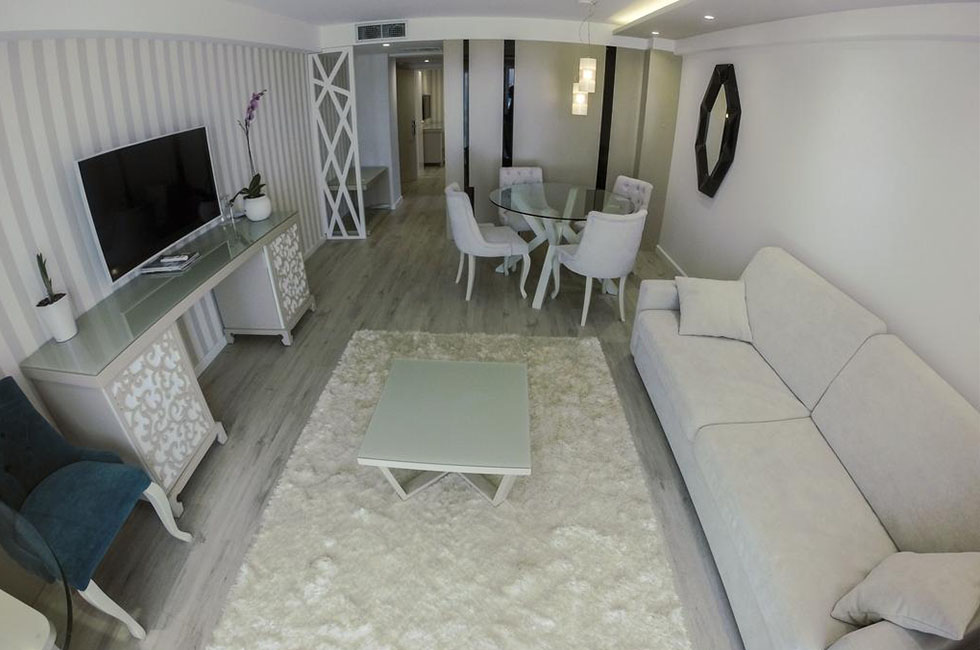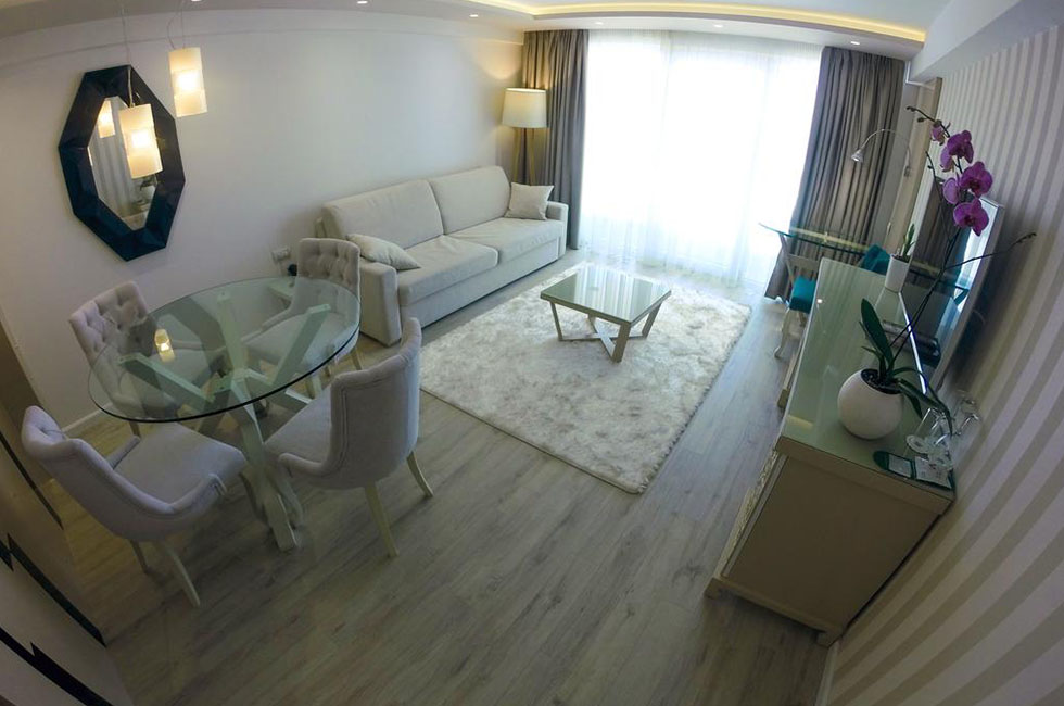 CORNER SUITE room, близько 82 м², покращений двокімнатний номер з видом на море (SV). Розділений на спальню і вітальню. У спальні - 1 двоспальне ліжко розміру King size, у вітальні - великий диван (може бути використаний, як спальне місце для 2-х чоловік). Всього 1 номер в готелі.