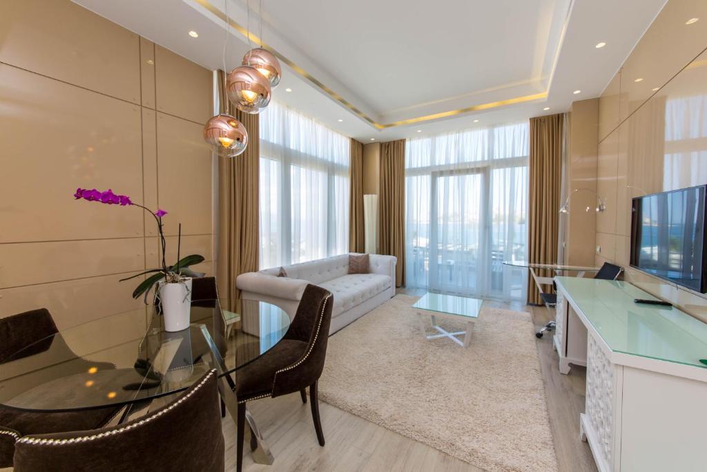 DELUXE SUITE room, близько 78 м², покращений двокімнатний номер з частковим видом на море (Partial SV). Розділений на спальню і вітальню. У спальні - 1 двоспальне ліжко розміру King size, у вітальні - диван (може бути використаний, як спальне місце для одного дорослого або двох дітей). Всього 1 номер в готелі.