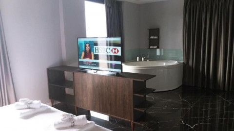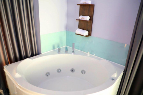 SUITE SV with Jacuzzi, близько 55 м2, великий однокімнатний сьют з прямим видом на море і гідромасажною ванною (джакузі). В наявності одна двоспальне ліжко. Додаткова розкладне ліжко для дитини від 5 років і старше або дорослого за запитом за додаткову плату. Всього в готелі 4 номери.