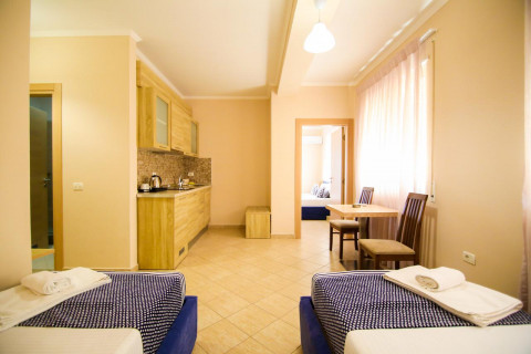 APARTMENT 1 + 1 SV (Apartmen With Mini Kitchen): (60 кв.м) - двокімнатний апартамент з міні-кухнею. В наявності 1 двоспальне ліжко та 2 односпальні ліжка. На 4чол. Всього в готелі 5 апартаментів. Прибирання номерів і апартаментів проводиться щодня. Зміна постільної білизни - 1 раз в 3 дня (частіше - за запитом).